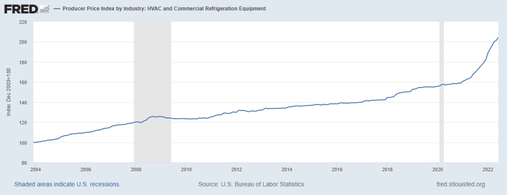 [3] U.S. Bureau of Labor Statistics, Producer Price Index by Industry: HVAC and Commercial Refrigeration Equipment [PCU3334133341], retrieved from FRED, Federal Reserve Bank of St. Louis; https://fred.stlouisfed.org/series/PCU3334133341, July 20, 2022.